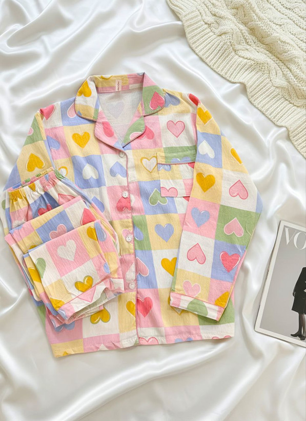 ست دو تیکه استین بلند نخی موسلین زنانه با طرح قلب رنگی رنگی | فری سایز
